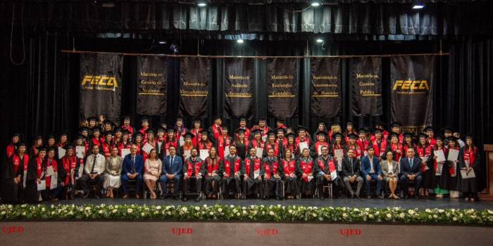 -La Facultad de Economía, Contaduría y Administración (FECA) de la Universidad Juárez del Estado de Durango (UJED) llevó a cabo la entrega de cartas de pasante a seis generaciones de sus programas de especialidad y maestría, las cuales —por motivos administrativos— no habían sido entregadas desde el año 2020.